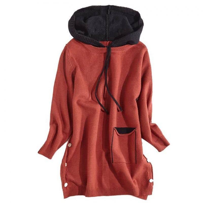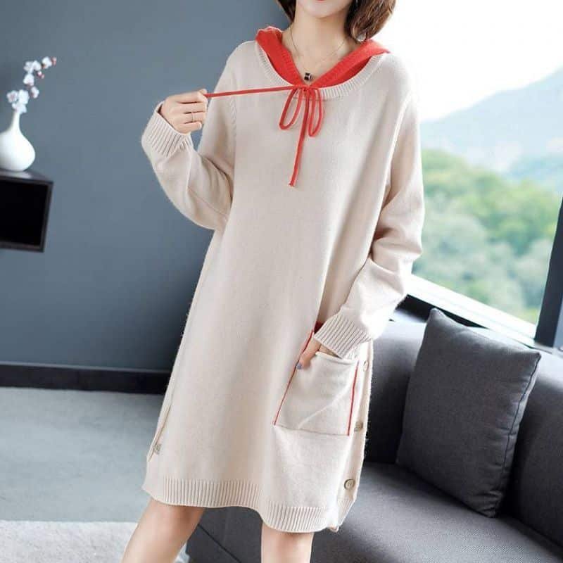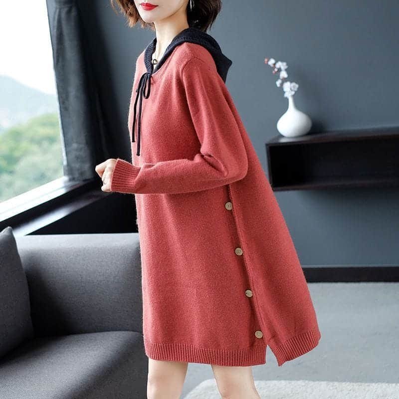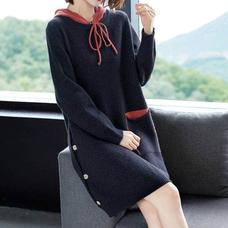 Girls Loose-fitting Outerwear Top Hooded Mid-length Sweater Dress