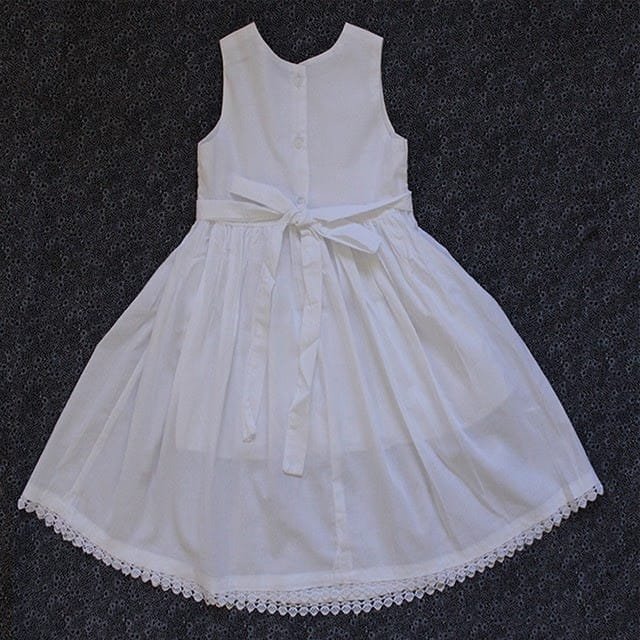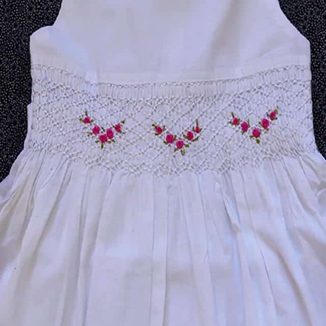 This white smocked dress is a stylish design with perfect embroidered roses on smocked body  and above the hem. Perfect for a cute girl for her Christening function or for a memorable event of the life. This is another unique creation from Sanvo Fashion