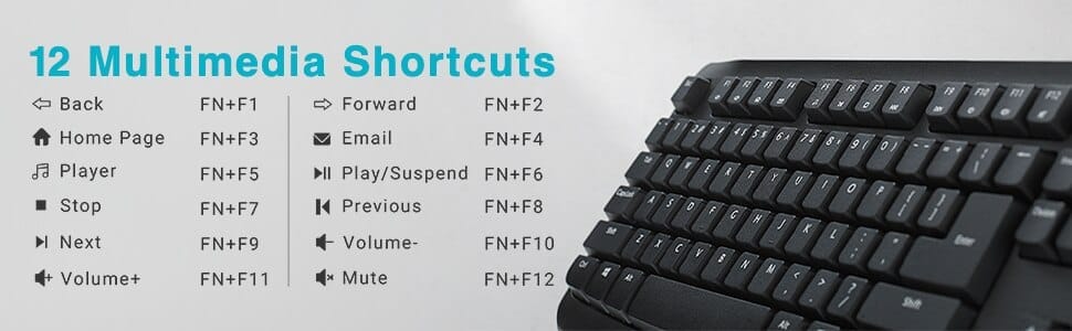 – Multimedia shortcuts and Mouse for left right hand use: 12 multimedia shortcut keys, fast switching multimedia functions, symmetric structure for left and right hand use, 1000 DPI for fast and accurate click, easy uses on multi-surface